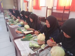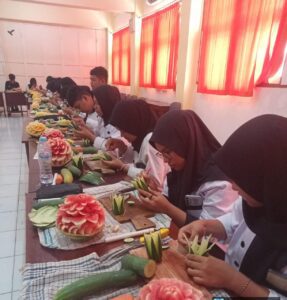 Mereka dengan serius memperhatikan instruktur yang memperkenalakan alat yang digunakan dalam fruit carving. Pada kegiatan kali ini peserta didik diharapkan mampu melakukan praktik Fruit Carving dan membuat Garnish. (eka/kul)